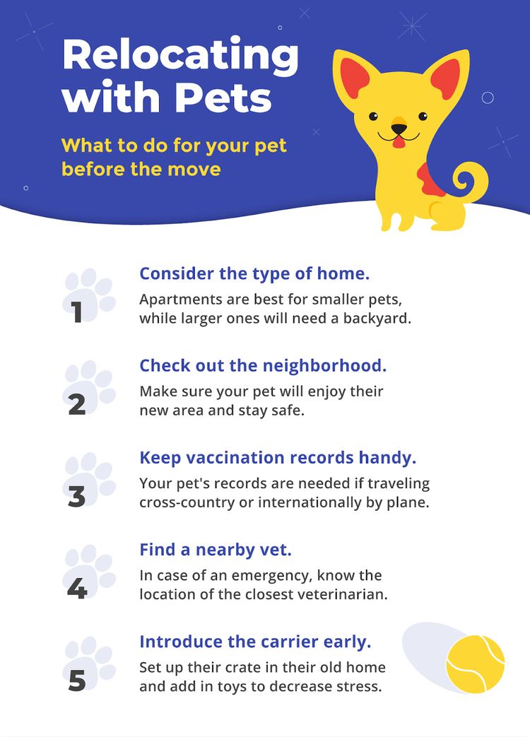 Before you begin your moving process, there are several steps you can take to prevent stress for you and your pet. Tactics like touring the neighborhood beforehand and setting up your pets’ space in the house can make them familiar to your new space.
